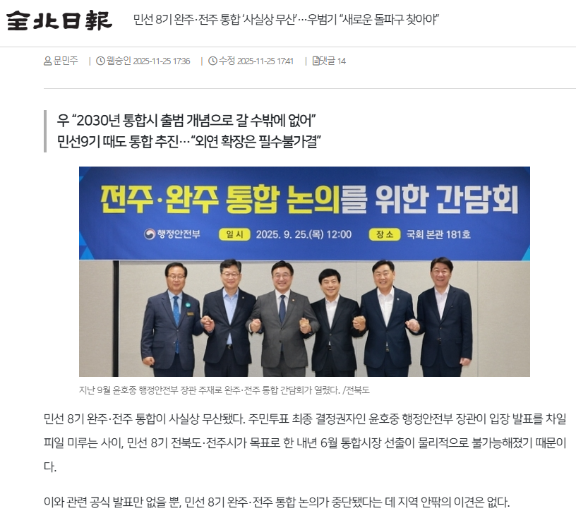※ 참고. 완주‧전주 통합 주민투표 여부 결정 지역 언론 주목받았지만... 근거 불확실하고 일정도 불투명(뉴스 피클 2025.10.15.)