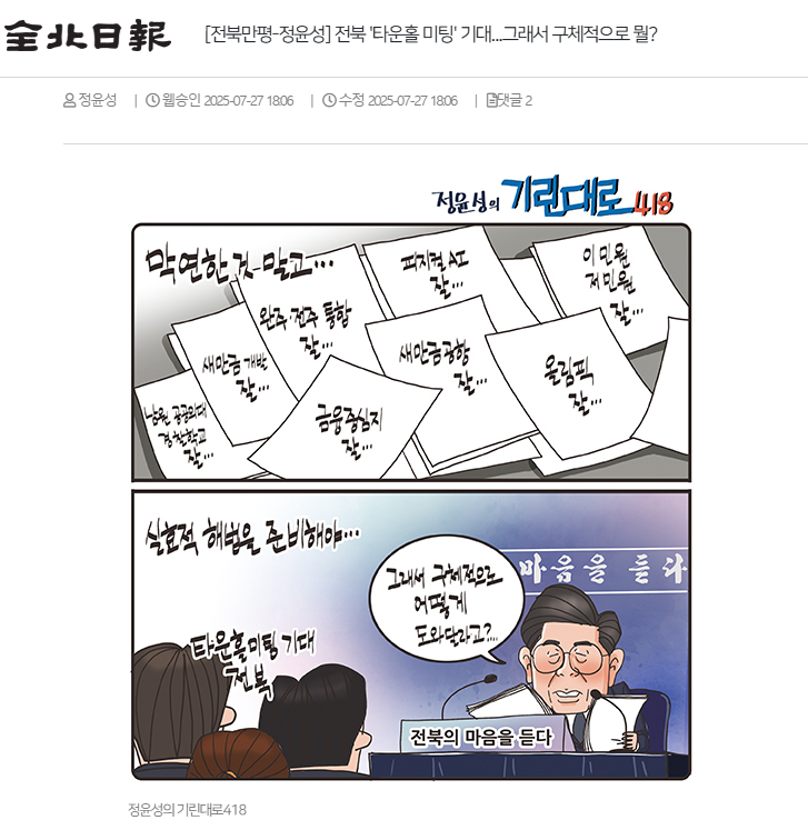 [전북일보 인터넷] [만평] 전북 '타운홀 미팅' 기대...그래서 구체적으로 뭘?(7/27, 정윤성)