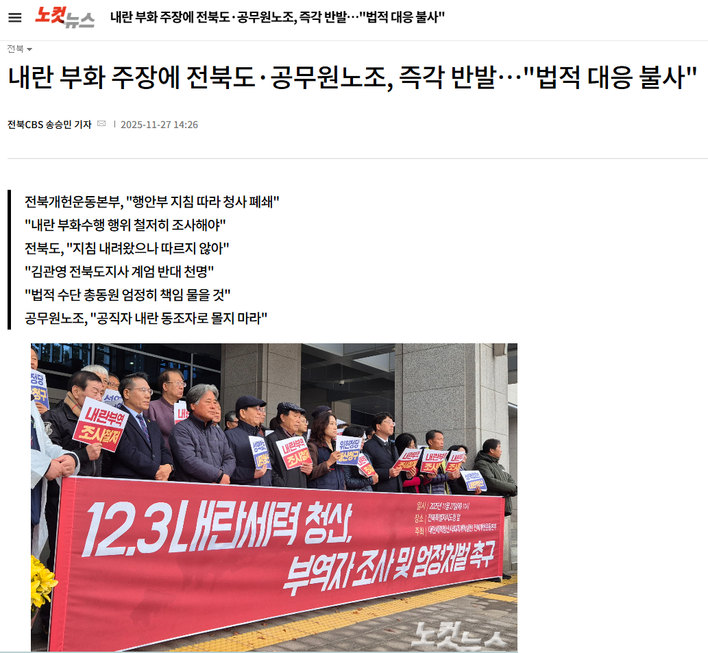 [노컷뉴스] 내란 부화 주장에 전북도·공무원노조, 즉각 반발…"법적 대응 불사"(11/27, 송승민)