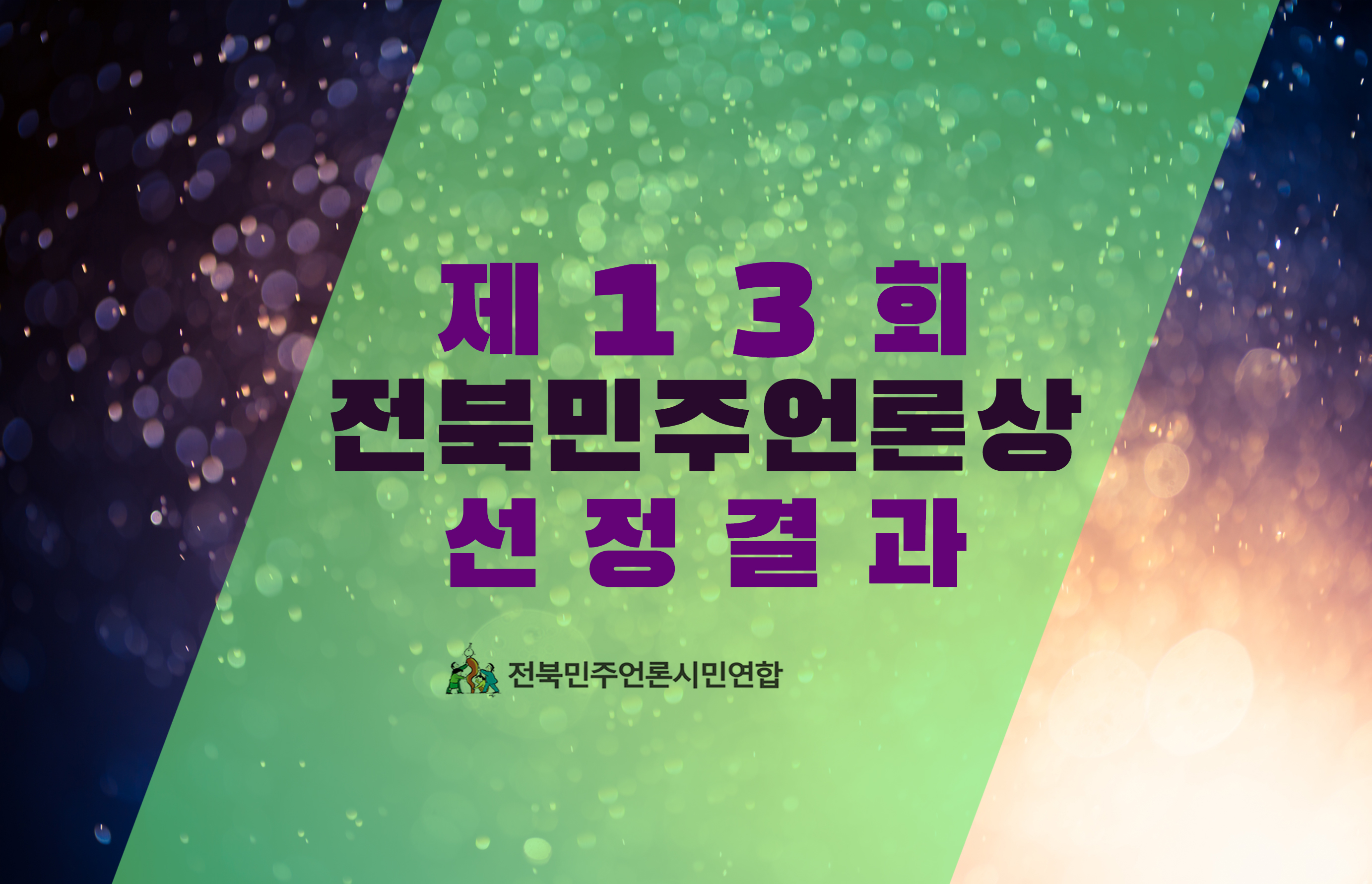 『제13회 전북민주언론상』 심사위원회는 올해 후보작에 대한 심사 결과 『제13회 전북민주언론상』에 KBS전주방송총국 김현주 취재 기자, 한문현·김동균·정성수 촬영 기자의 <사찰과 요양원, 건설 업체 연결 고리는 ‘스님’>를 선정했습니다. 『제13회 특별상』에는 CBS전북방송 김대한·심동훈 기자의 <더 매뉴얼: 전북 산업재해 톺아보기>와 부안독립신문의 <부안독립신문 백지 광고 투쟁>을 공동 수상자로 선정했습니다.