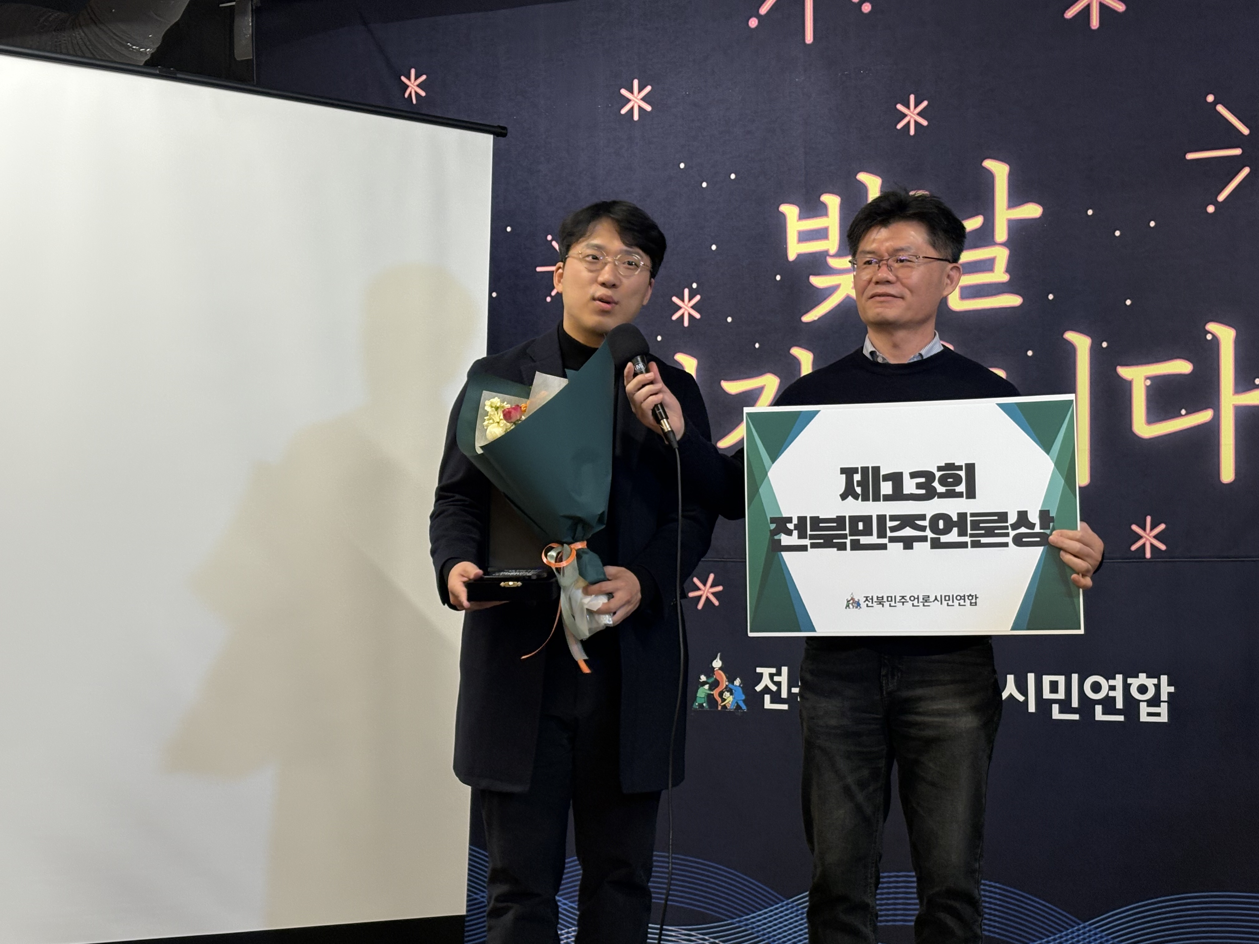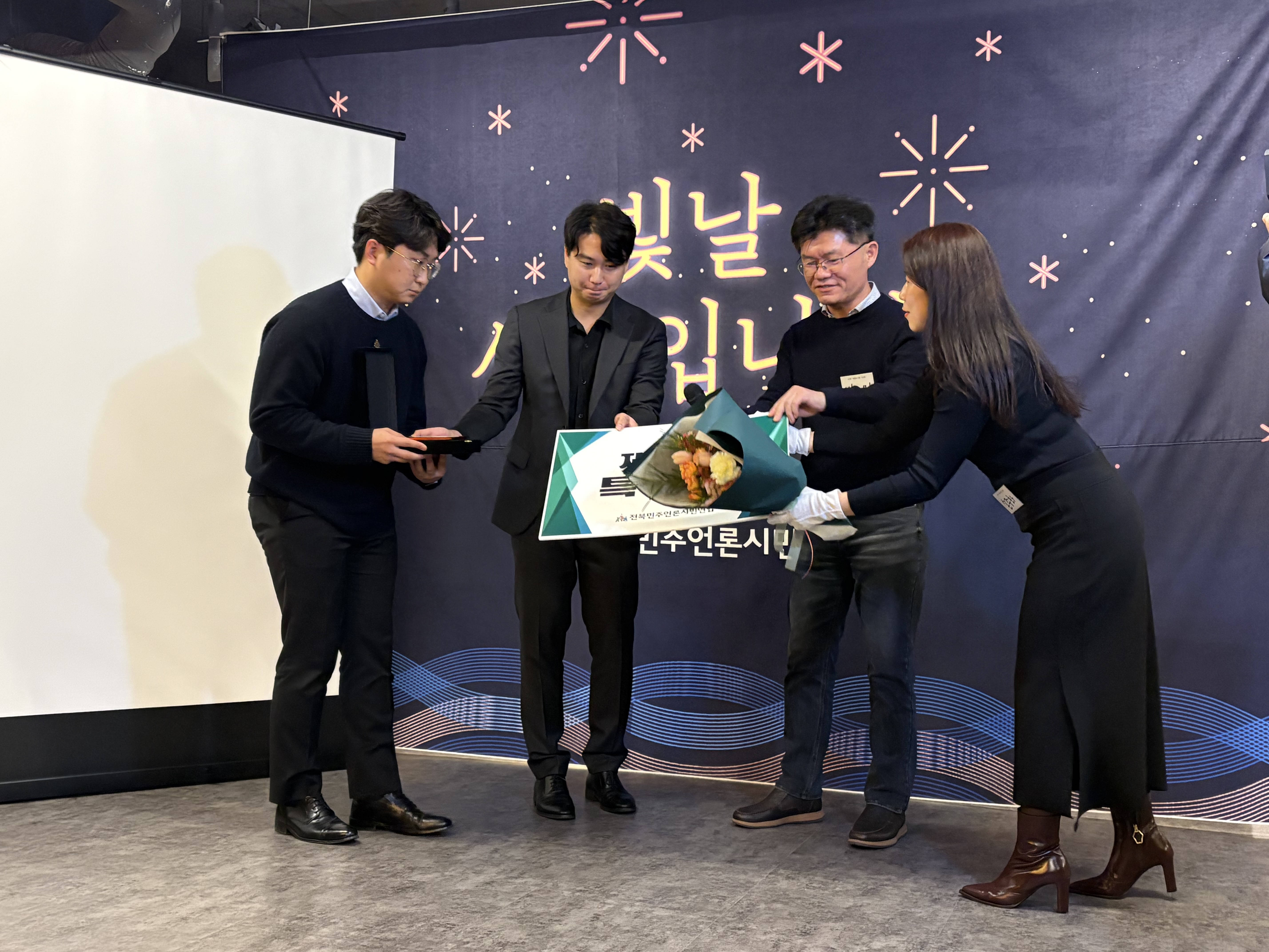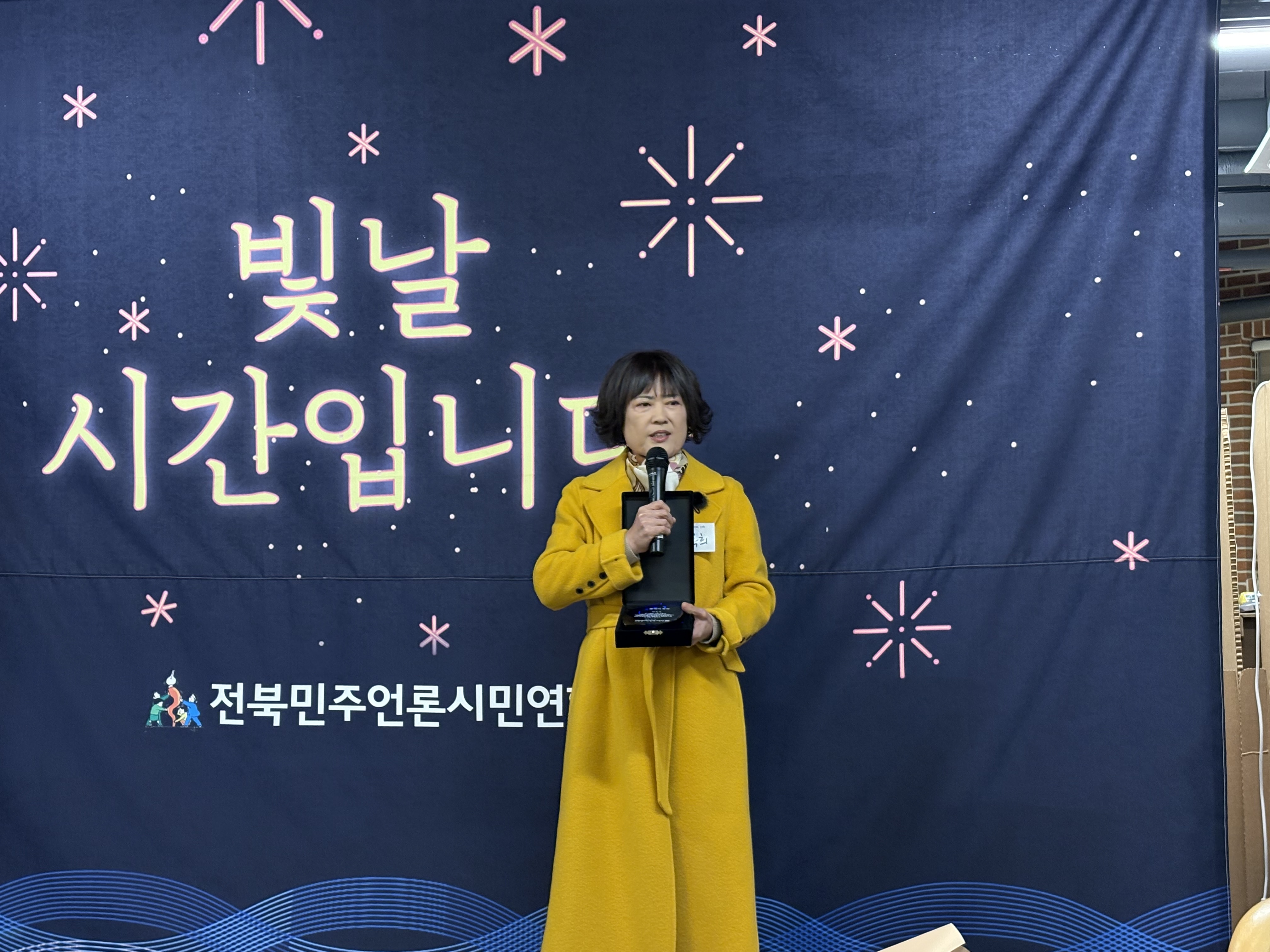 전북민주언론상에는 <사찰과 요양원, 건설 업체 연결 고리는 ‘스님’> 연속보도를 한 KBS전주방송총국 김현주 취재 기자, 한문현·김동균·정성수 촬영 기자가 받았습니다. 정성수 기자님이 대표로 오셔서 수상 소감을 전했습니다.