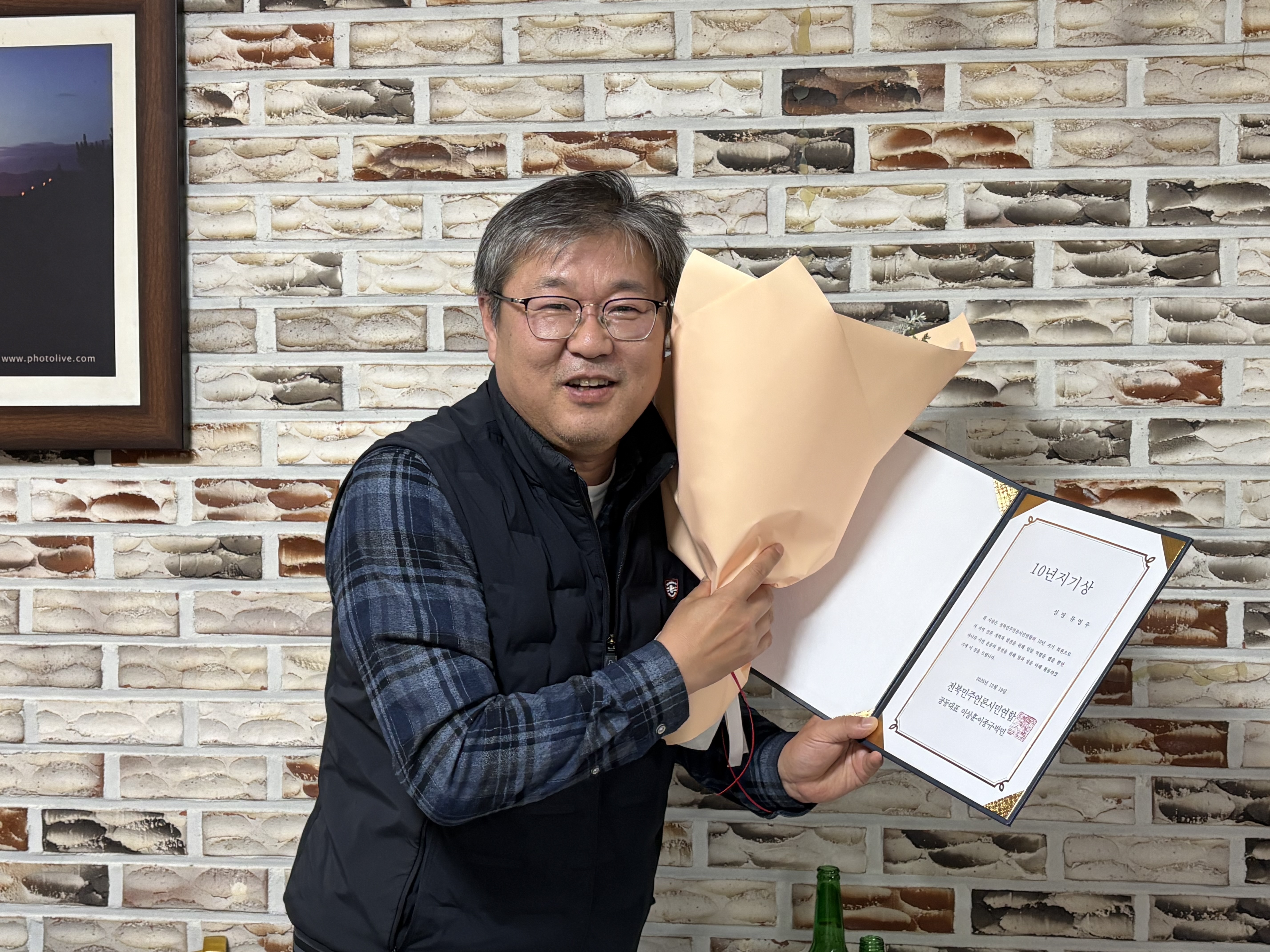 올해로 전북민언련 10년 지기 회원이 되신 분은 19명, 20년 지기 회원이 되신 분은 5명입니다. 10년지기 회원님 두 분이 오늘 참여가 가능하셔서 상장을 준비했었는데요. 올해 10년 지기 회원을 대표해서 권경화 회원님이 수상하셨습니다. 시상은 작년 10년 지기 회원이셨던 김진원 회원님이 해주셨습니다. 류영우 회원님은 아쉽게도 시상식 이후 식사 자리에서 전달해드렸습니다.