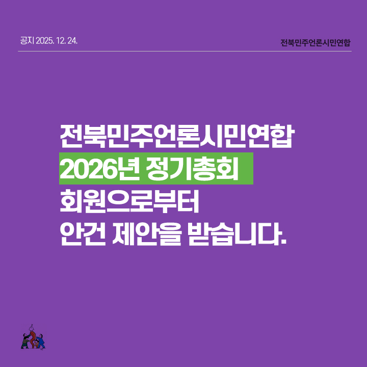 2026년 정기총회 회원으로부터 안건 제안을 받습니다. 전북민주언론시민연합 총회준비위원회 내규 제4조(총회 안건의 상정)에서는 "위원회는 총회 개최 전 회원으로부터 안건을 제안받을 수 있