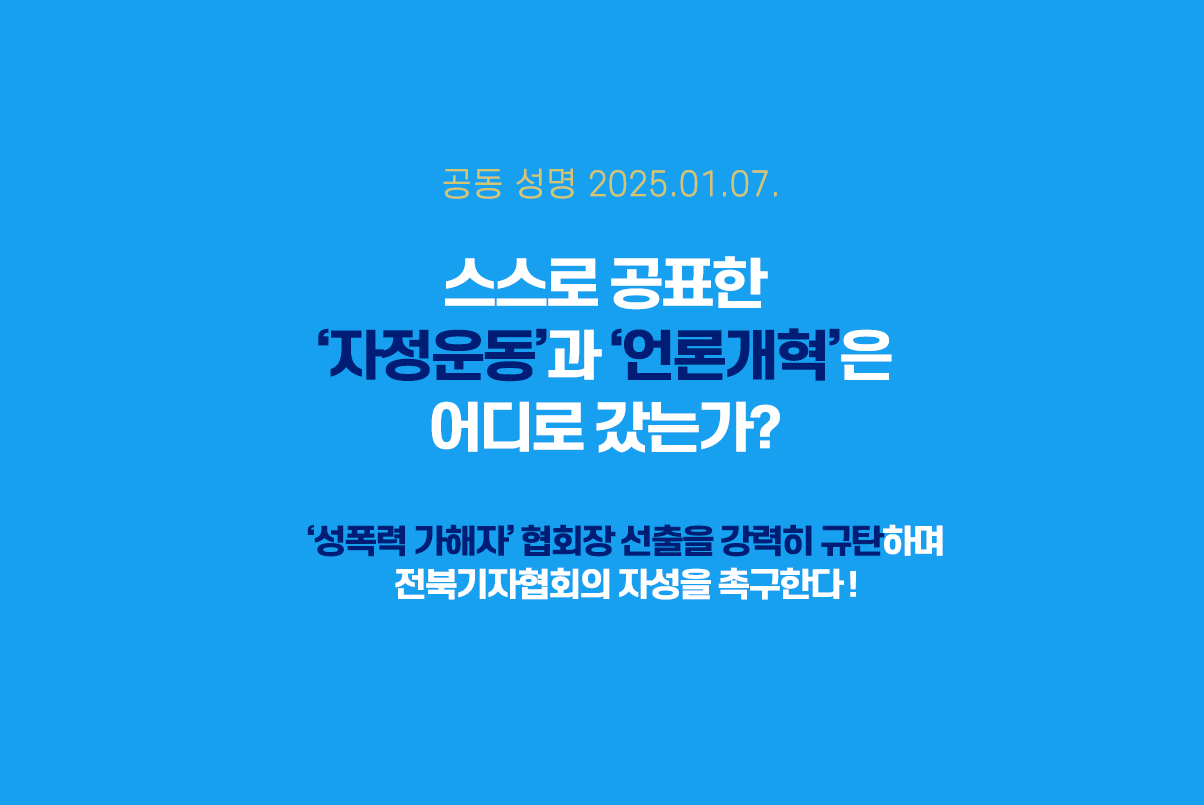전북기자협회가 시대의 흐름과 시민의 신뢰를 저버렸다. 우리는 성폭력 가해로 사회적 지탄을 받은 인물이 300여 명의 기자를 대표하는 협회장으로 당선된 이번 사태에 참담함을 느끼며, 전북기자협회의 존재 이유를 묻지 않을 수 없다.