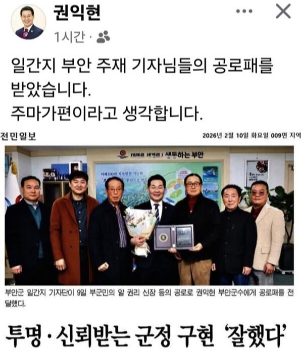 이러한 군수의 소통 부재 지적은 단지 몇 번의 해프닝이 아닌 몇 년 간 이어진 비판의 핵심이었다. 반면 주목할 이벤트가 있었다. 바로 부안군청을 출입하는 출입 일간지 기자들은 부안군수에게 “지역 언론과 성실하고 열린 소통, 알 권리 신장”을 했다는 명분으로 지난 9일 공로패를 시상한 것이다. 이 소식이 알려지자 <부안군 촛불행동·초고압송전철탑 백지화 부안군 대책위원회>는 성명을 내고 “부안군수는 공로패를 받을 사람이 아니라, 군민 앞에 답해야 할 사람”이라며 부안의 현실이 과연 ‘소통행정’이냐며 울분을 토로했다. 하지만 이러한 출입 일간지 주재기자들의 행태를 비판의 목소리는 미디어를 감시하는 언론사인 <미디어오늘>과 <전북의소리>, 그리고 권 군수를 비판해 온 부안지역 풀뿌리언론사 외에는 보도되지 않았다.