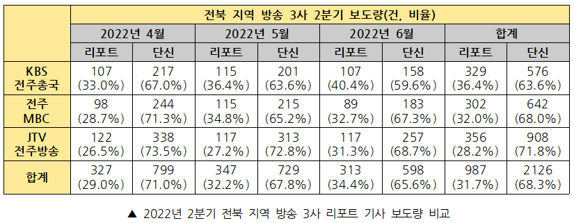2022년 2분기(4월~6월) 동안 전북 지역 방송 3사의 총 보도량은 3113건(리포트 987건, 단신 2126건)이다. 세부적으로 살펴보면 다음과 같다. 리포트 기사 비중은 KBS전주총국이 36.4%로 가장 많았고, 단신 기사 비중은 JTV전주방송이 71.8%로 가장 많았다.