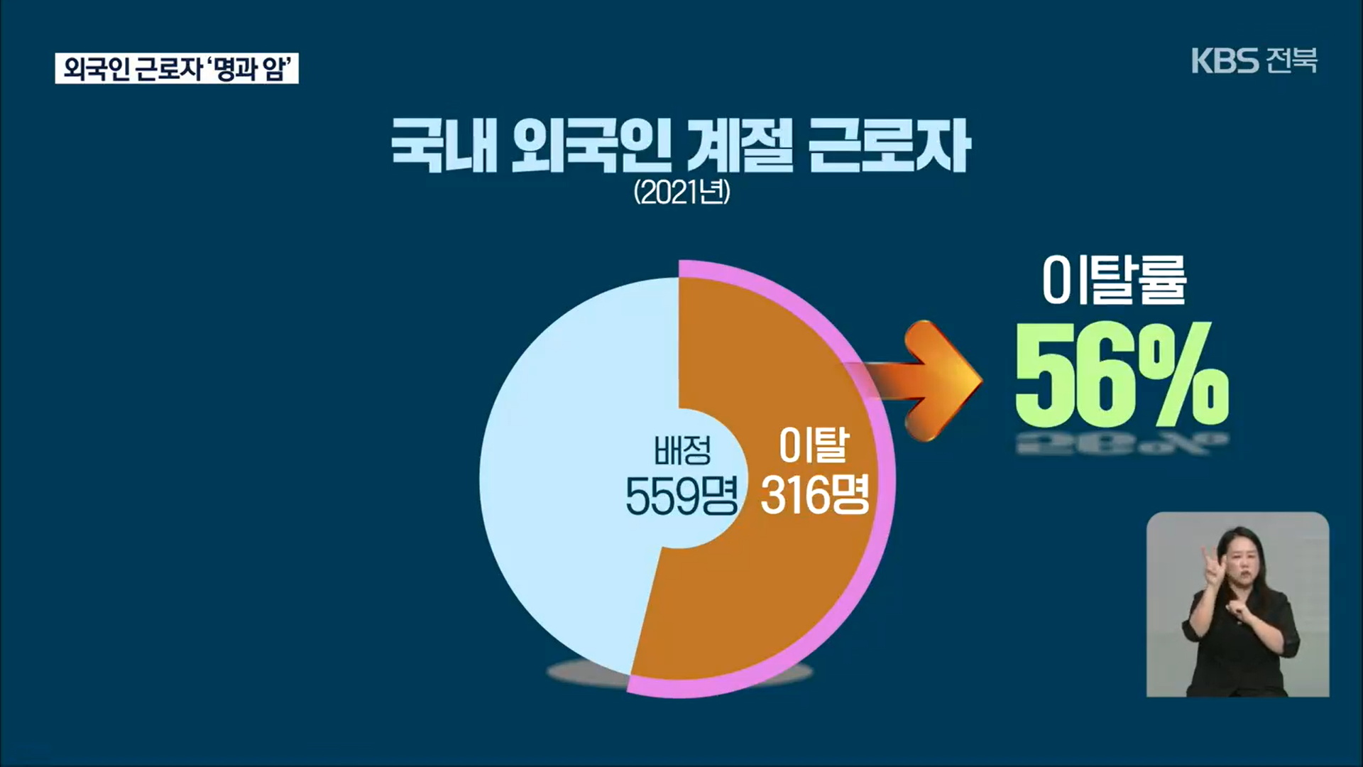 15일 KBS전주총국은 “외국인 노동자의 도움 없이 농사를 지을 수 없는 게 요즘 농촌의 현실이지만 어렵게 구한 외국인 노동자들이 계약을 어기고 무단이탈하는 사례가 잇따르고 있다.”라고 보도했는데요, 전라북도만의 문제가 아닙니다. 지난해 전국의 외국인 계절 근로자 이탈률이 56%로 절반이 넘습니다. 이후 불법 체류 등의 문제로 이어질 가능성이 커 해결이 필요한 상황입니다.
