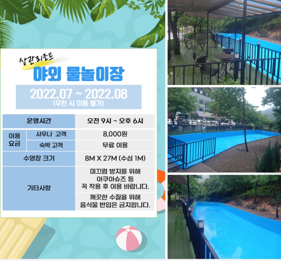 자체 수영장도 마련되어 있다고 합니다. 아이들이 오면 물놀이 할 수 있어요.