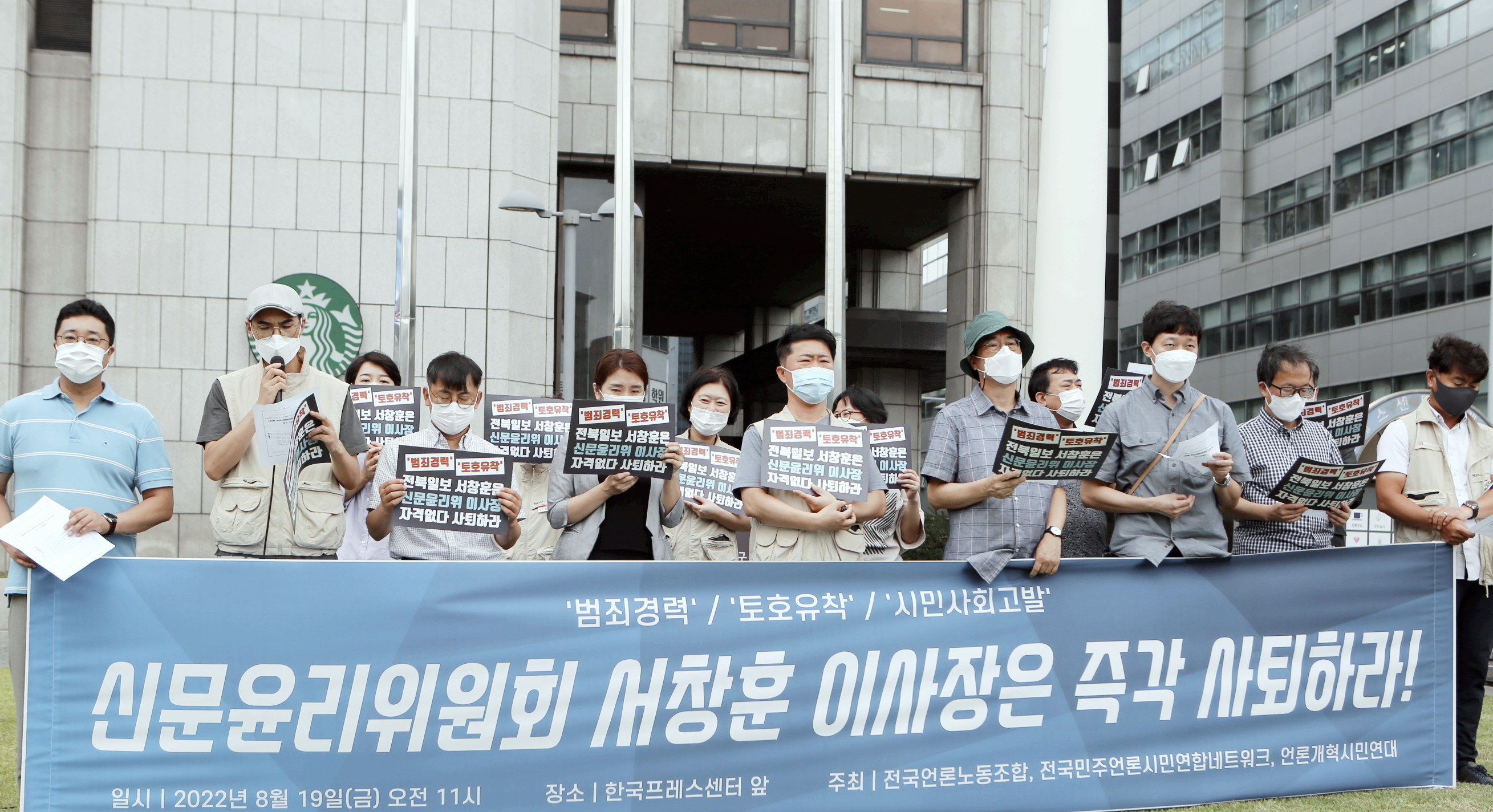 | [보도자료] 서창훈 한국신문윤리위원회 이사장 퇴진 요구 기자회견 개최(20220826) (0) | 2022.08.18 |