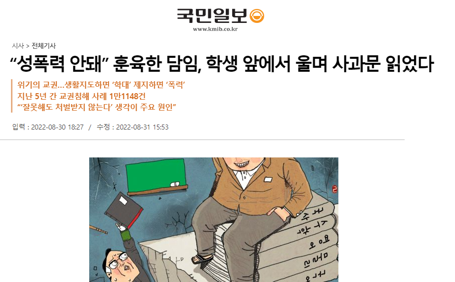 [국민일보] “성폭력 안돼” 훈육한 담임, 학생 앞에서 울며 사과문 읽었다(8/30, 성윤수, 김판)