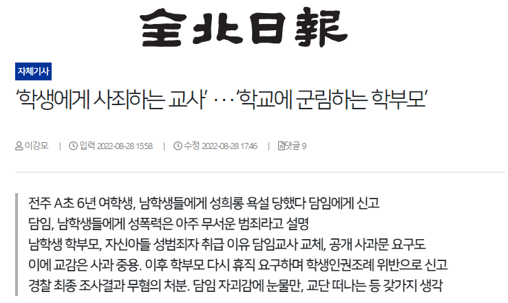 [전북일보] ‘학생에게 사죄하는 교사’ ···‘학교에 군림하는 학부모’(8/28, 이강모)