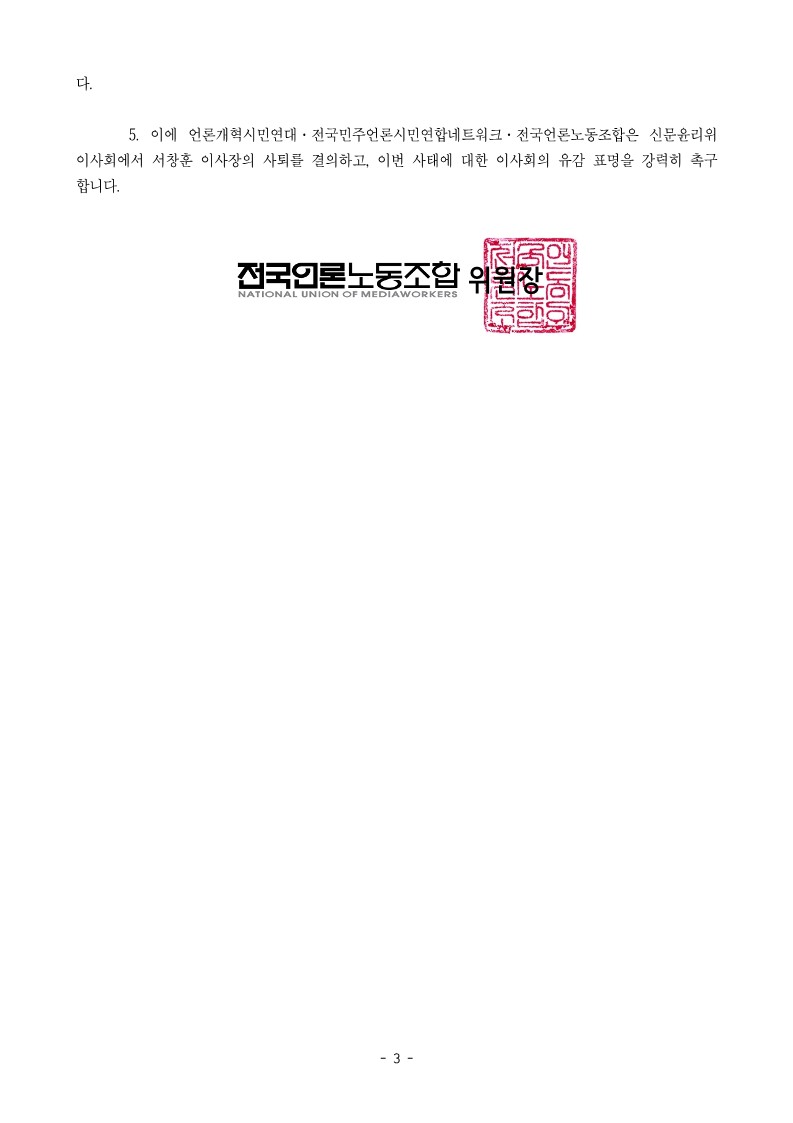 4. 언론노조 등은 이번 사태 해결을 위해 신문윤리위 이사회가 서 이사장의 퇴진을 결의하는 한편 위원회의 책임 있는 입장 표명도 요구했다.