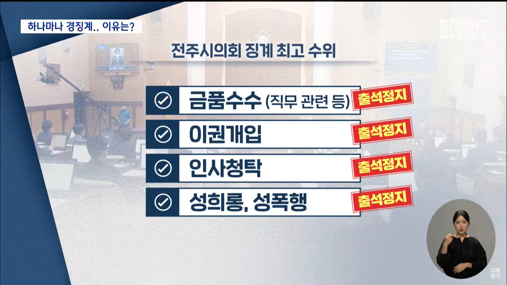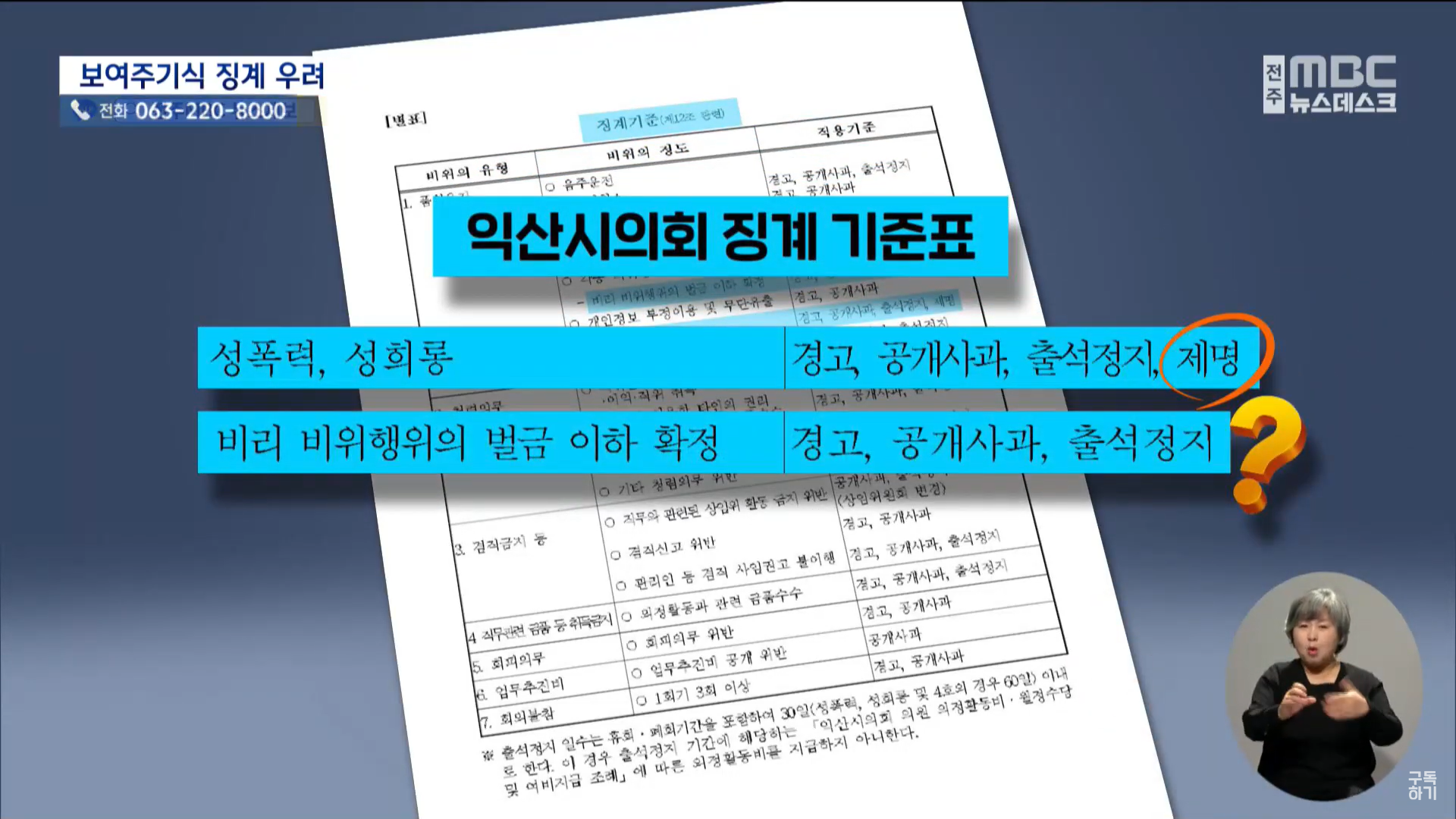 지난 20일 전주MBC는 “솜방망이 처분이라는 지적이 나오는데 다 이유가 있었다”라며, 전주시의회가 자체 기준으로 정한 징계 최고 수위 중 일부를 공개했습니다.