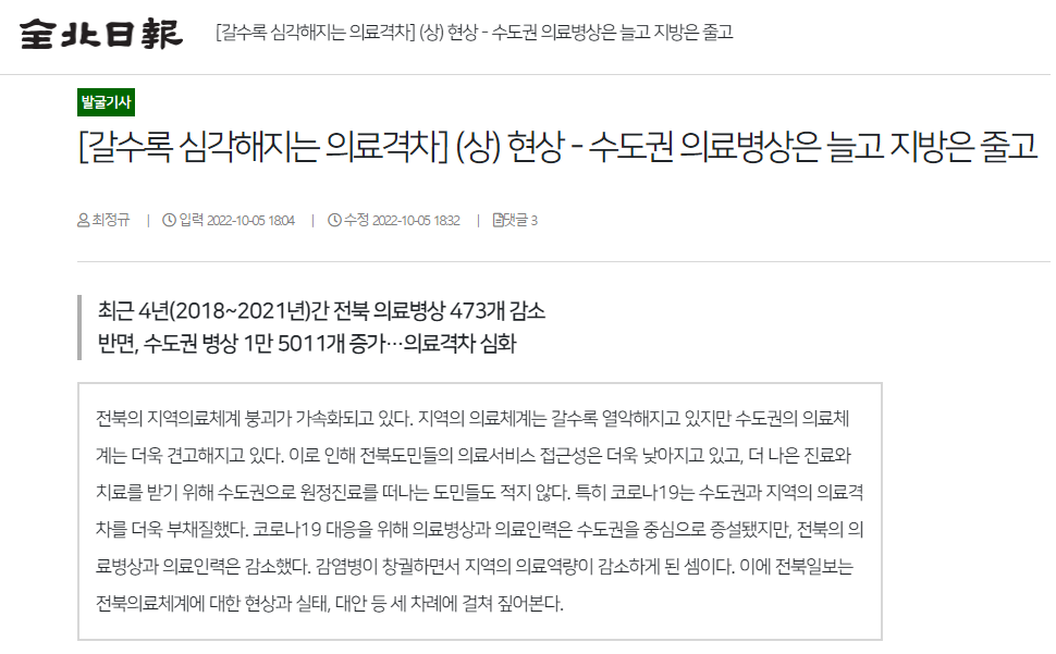 전북일보는 “코로나19 대응을 위해 의료 병상과 의료 인력이 수도권을 중심으로 증설됐지만, 전북의 의료 병상과 의료 인력은 감소했다.”라며, 의료 격차가 점점 심해지고 있는 현실을 보도했습니다. 전북일보는 “복지부는 수도권의 의료 병상이 늘어난 이유가 인구가 많은 지역이기 때문이라고 밝혔지만, 의료 서비스는 단순히 인구 논리로만 봐서는 안 된다는 지역 의료계의 반박이 있다.”라고 지적했습니다.
