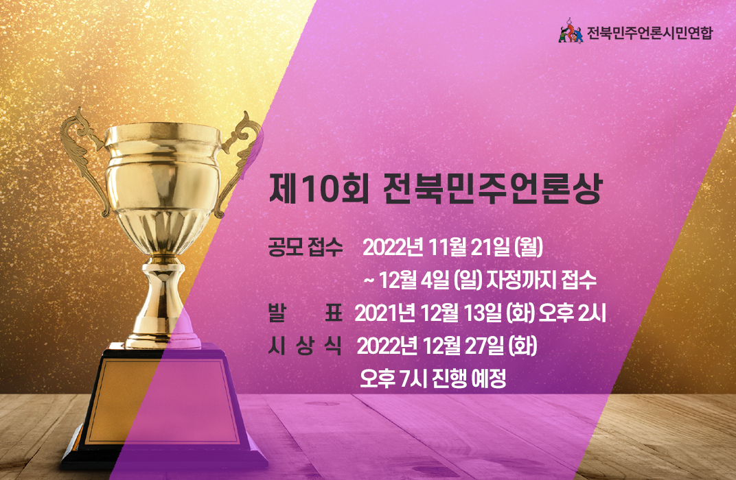 전북민주언론시민연합(공동대표 김은규, 이상훈, 이종규)은 지역 언론의 발전방향을 모색하고 바른 언론의 상을 정립하기 위하여 지역 방송과 신문, 풀뿌리언론, 그리고 인물과 단체를 대상으로 「제10회 전북민주언론상」을 추천받습니다.