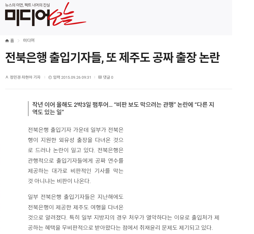 [미디어오늘] 전북은행 출입기자들, 또 제주도 공짜 출장 논란(2015/9/26, 정민경, 차현아)