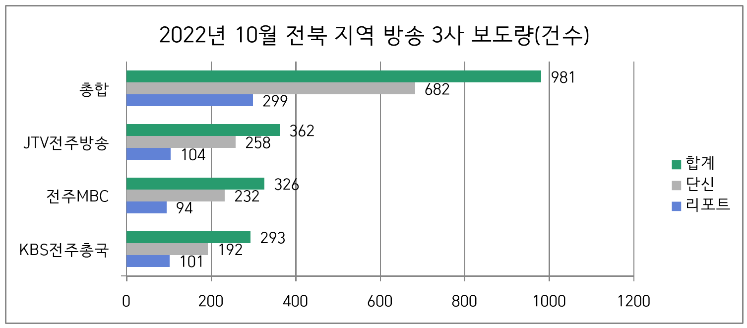 2022년 10월 전북 지역방송 3사 보도량은 리포트 기사 299개(30.5%), 단신 기사 682개(69.5%)로 총 981건이다. 각 방송사별로 살펴보면 다음과 같다.