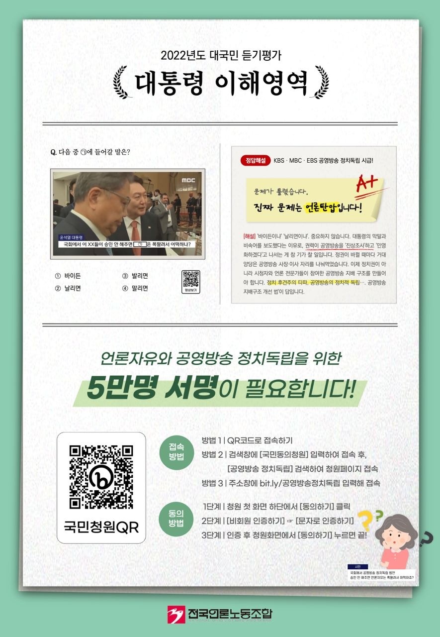 최근 윤석열 대통령의 비속어,욕설 파문 이후 집권 세력에 의한 언론자유 탄압과 방송장악, 민영화 시도가 노골화되고 있습니다. 권력의 입맛에 맞지 않는 언론을 길들이고 시민의 이익을 대변해야 할 집권세력이 공영언론을 장악하거나, 소수 재벌에게 넘기려는 것은 반헌법적 작태로 독재시절에나 가능했던 퇴행입니다. 언론자유를 공고히 하고 공영방송의 정치적 독립 강화를 위해 KBS, MBC, EBS 사장 선임에 시청자.시민의 참여를 제도적으로 보장하고 이사회 구성 시 다양한 계층과 전문가의 목소리를 반영할 수 있도록 관련 법률 개정안을 조속히 심의하고 통과시켜 주시기 바랍니다.