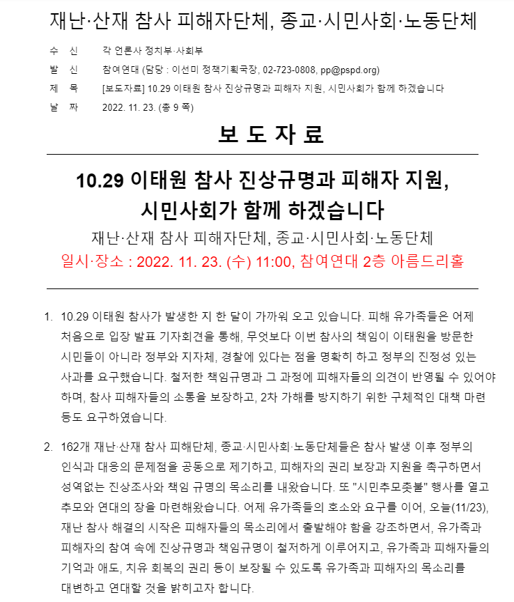 “10.29 이태원 참사 진상규명과 피해자 지원, 시민사회가 함께 하겠습니다” 기자회견이 오늘(23일) 11시 참여연대에서 진행됐습니다.