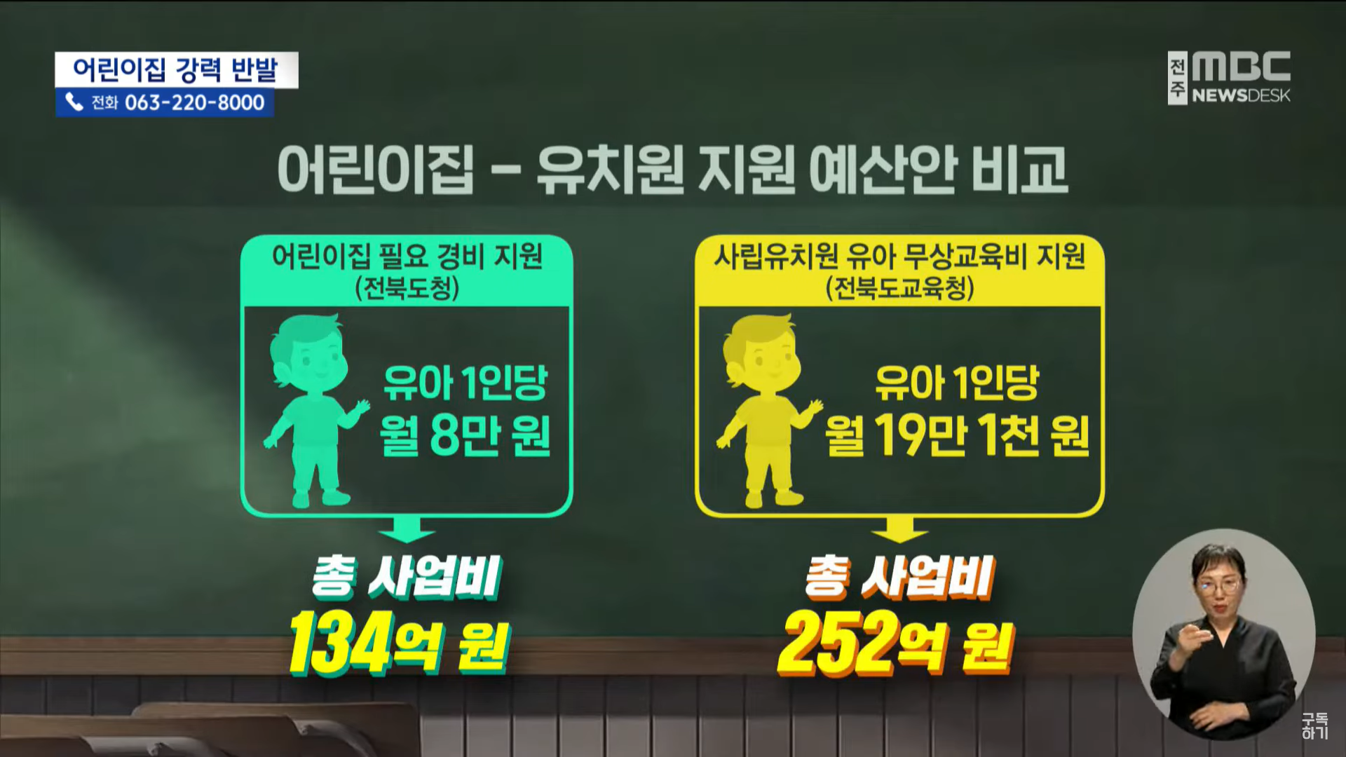 그런데 두 기관의 지원 예산 차이가 지나치게 커 차별 논란이 발생했습니다. 전라북도가 어린이집에 지원하기로 한 예산은 유아 1인당 월 8만 원인데, 전북교육청이 사립 유치원에 지원하기로 한 예산은 유아 1인당 월 19만 천 원으로 두 배가 넘는데요, 두 기관의 재정 상황 차이로 인해 편성한 예산에 차이가 발생한 것입니다.