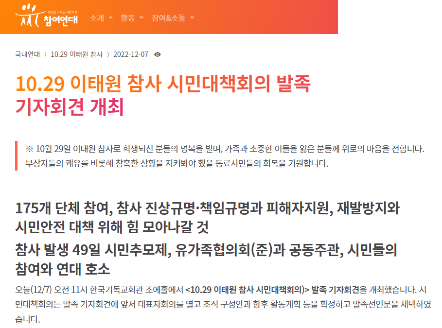 10.29 이태원 참사 시민대책회의 발족 기자회견 개최 - 참여연대 - 10.29 이태원 참사