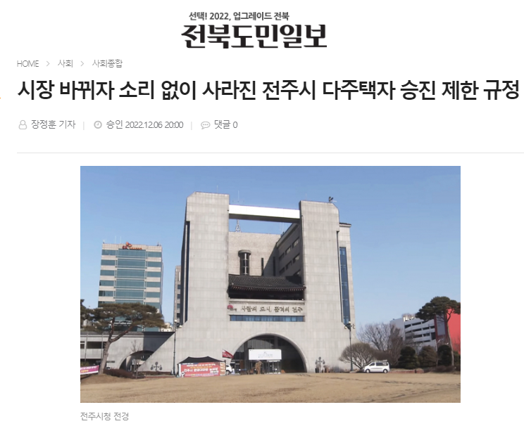 이런 상황에서 지난 7일 전북도민일보 보도에 따르면 전주시 다주택 공무원 승진 제한 인사규정이 사라졌습니다. 시기는 지난 7월로 우범기 시장이 취임한 지 한 달 만인데, 관련 보도는 4개월이 넘어서 나왔습니다.