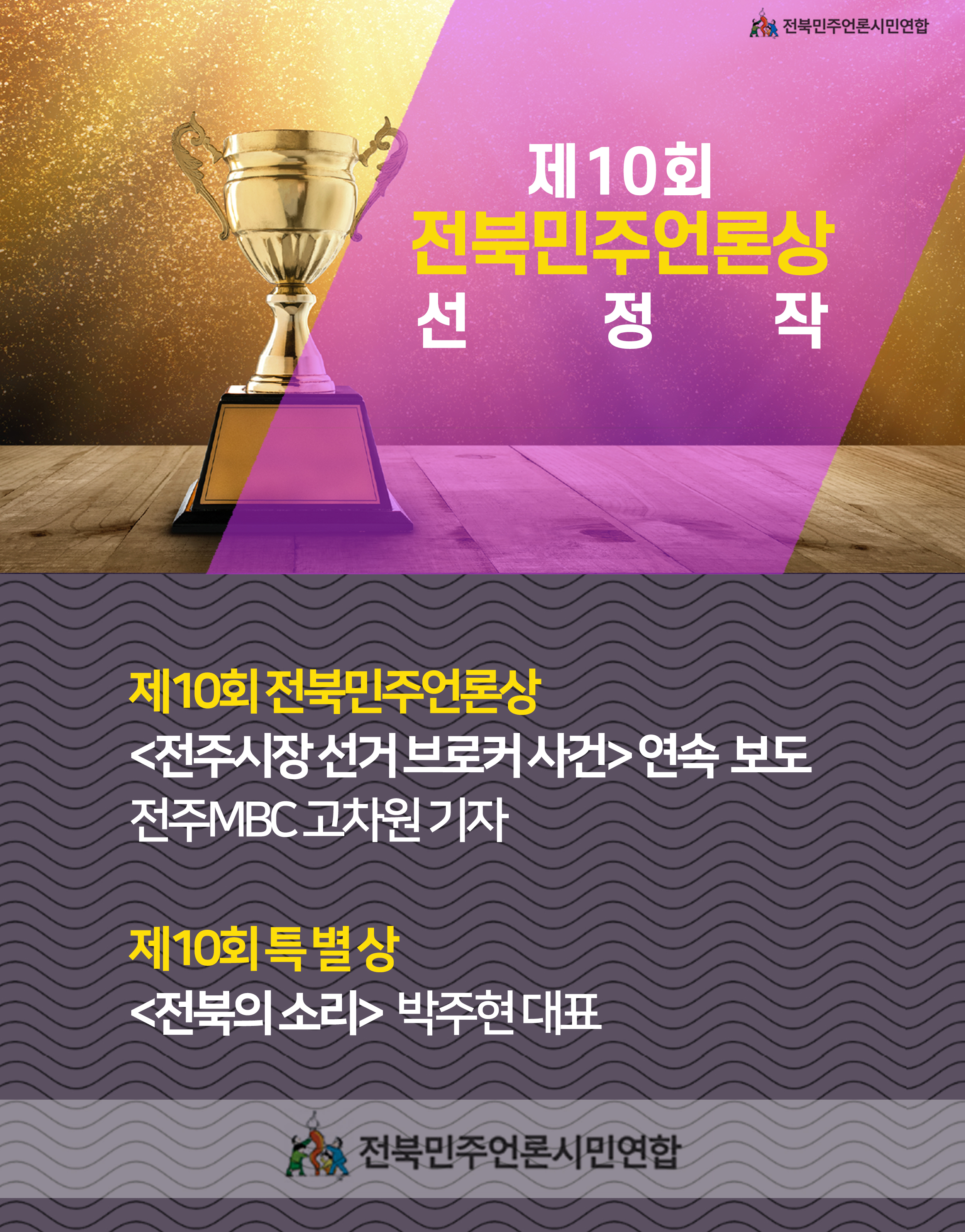 『제10회 전북민주언론상』 심사위원회는 올해 후보작에 대한 심사 결과 전북민주언론상에 전주MBC 고차원 기자의 <전주시장 선거 브로커 사건>을, 특별상에 <전북의 소리> 박주현 대표를 선정했습니다. 언론의 사명인 참여적 공론장을 환기시키고 지역성 강화를 목적으로 제정된 본상은 열악한 매체 환경에서도 제 역할을 수행하기 위해 고군분투하는 언론인들의 사기를 진작하기 위해 제정되었습니다. 저희 심사위원들은 어려운 여건에서도 묵묵히 자신의 역할을 다해왔던 지역 언론인들의 노고에 다시 한번 감사의 인사를 드립니다.