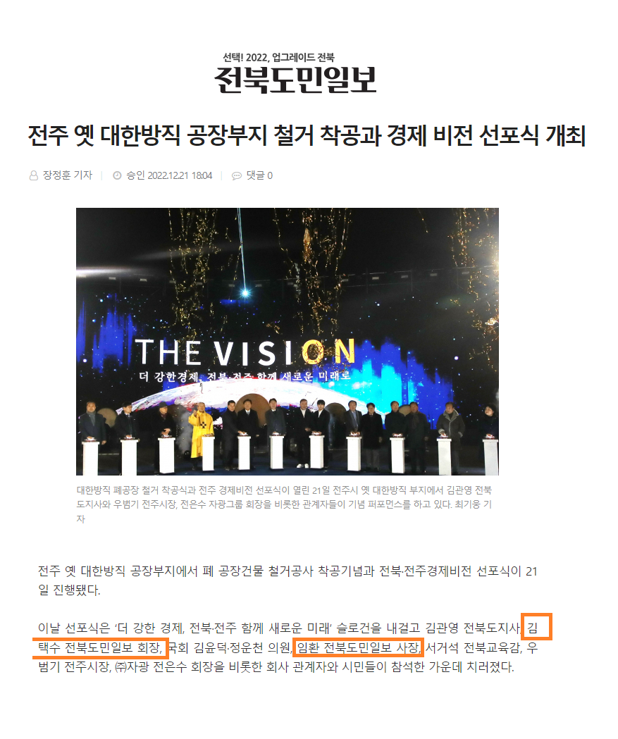 2022년 12월 21일 오후 5시 예정된 (주)자광의 전주 경제 비전 선포식에 앞서 오후 4시 진보당 전북도당, 전북민주언론시민연합, 전주시민회는 기자회견을 열고 자광의 철거 착공식이 지역 유력인사를 앞세운 겉치레 행사에 불과할 수 있다는 점, 부동산PF 문제, 개발업체 편드는 특혜 행정 중단, 전라북도의 행정적 책임을 촉구 했습니다.