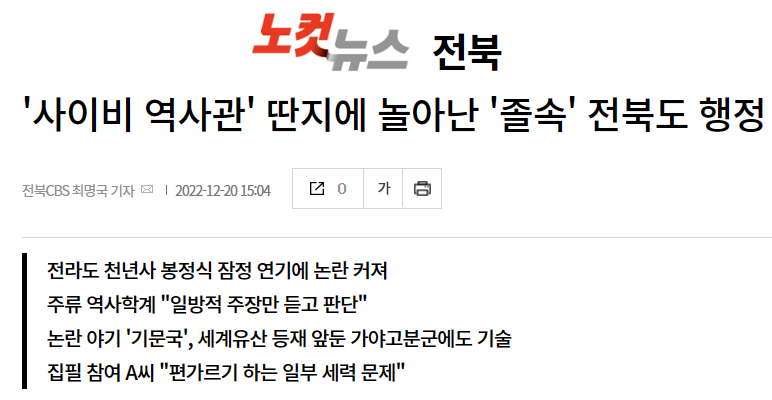 [전북일보] 5년 공들인 ‘전라도 천년사’ 봉정식 앞두고 역사 왜곡 논란(12/19, 박현우, 엄승현)