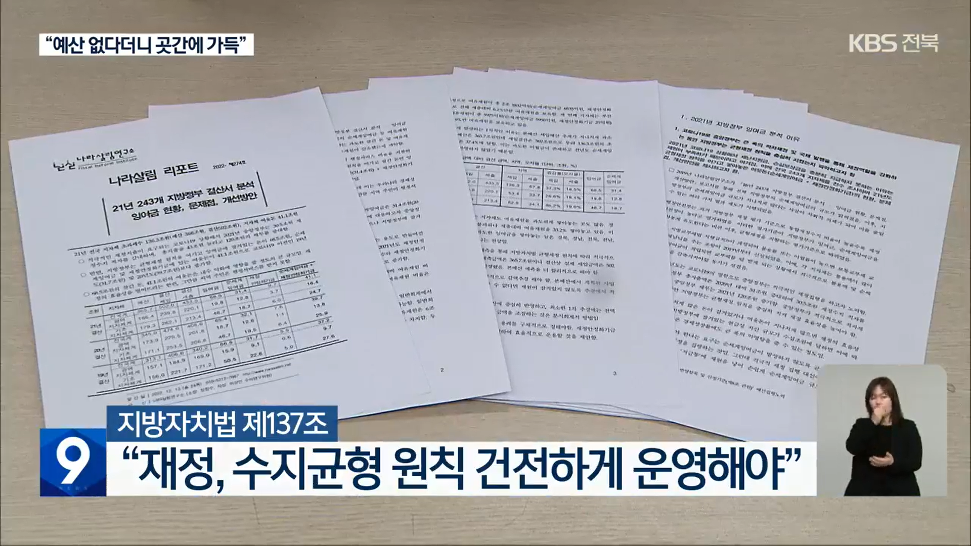 KBS전주총국은 지난 12월 13일 나라살림연구소가 발표한 <2021년 243개 지방정부 결산서 분석 - 잉여금 현황, 문제점, 개선방안> 보고서를 바탕으로 “현행 지방자치법은 세입과 세출이 거의 같은 이른바 균형 재정을 원칙으로 하는 만큼 사실상 규정 위반이다. 과도한 여유 재원은 돈이 돌지 않고 잠기도록 해 내수 경기 악화는 물론 행정과 재정의 효율성마저 떨어뜨릴 수 있다. 특히 전라북도는 매년 잉여금이 증가하는 추세”라며, 해소 방안이 시급하다고 지적했습니다.