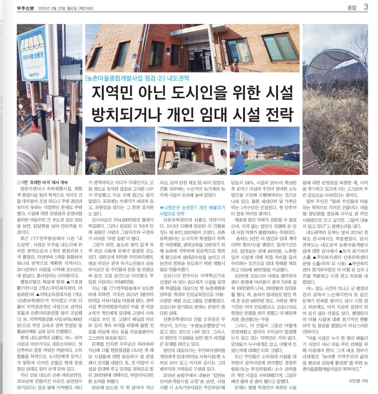 3. 지역민 아닌 도시인을 위한 시설 방치되거나 개인 임대 시설 전락(2/20, 1면, 3면, 이진경 취재기자)