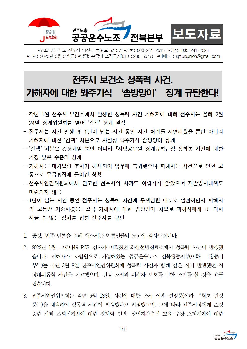 [전국공공운수사회서비스노조] [보도자료] 전주시 보건소 성폭력 사건, 가해자에 대한 봐주기식 ‘솜방망이’ 징계 규탄한다(3/3)