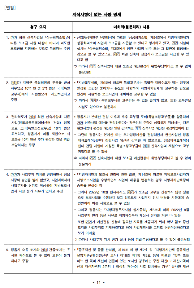 3. 전라북도가 회관 신축사업에 다른 사업(정읍체육트레이닝센터 건립) 명목으로 도비(특별조정교부금) 10억 원을 교부하고, 정읍시가 이를 재원으로 시 보조금 10억 원을 추가 편성한 것은 위법․부당하다는 주장