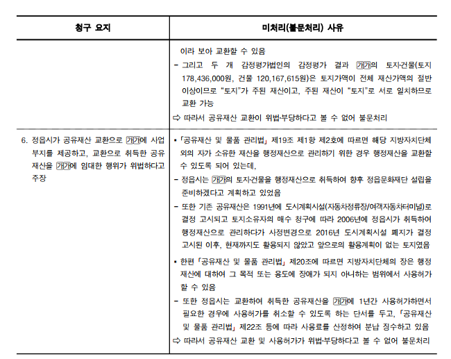 6. 정읍시가 공유재산 교환으로 사업 부지를 제공하고, 교환으로 취득한 공유재산을 임대한 행위가 위법하다고 주장