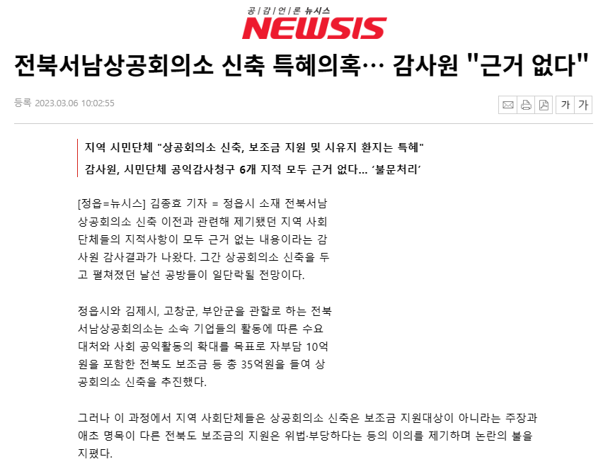 6일 뉴시스는 <전북서남상공회의소 신축 특혜의혹… 감사원 “근거 없다”> 보도에서 “정읍시 소재 전북서남상공회의소 신축 이전과 관련해 제기됐던 지역 사회단체들의 지적사항이 모두 근거 없는 내용이라는 감사원 감사 결과가 나왔다.”라며 지적사항이 없어 미처리된 내용만을 전달했습니다. 또한 <감사원 “근거 없다”>라고 큰 따옴표로 제목을 표기했는데 해당 표현은 불문 처리된 1개 항목에만 등장하는 표현으로 전반적인 내용을 포괄하는 지적사항이라고 보기는 어렵습니다.