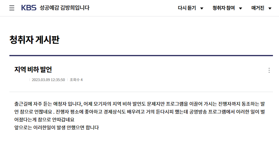 9일 <성공예감 김방희입니다> 청취자 게시판에서는 지역 비하 발언도 문제지만 진행자까지 동조하는 발언을 한 걸 문제라고 지적하는 청취자의 의견도 올라왔습니다.
