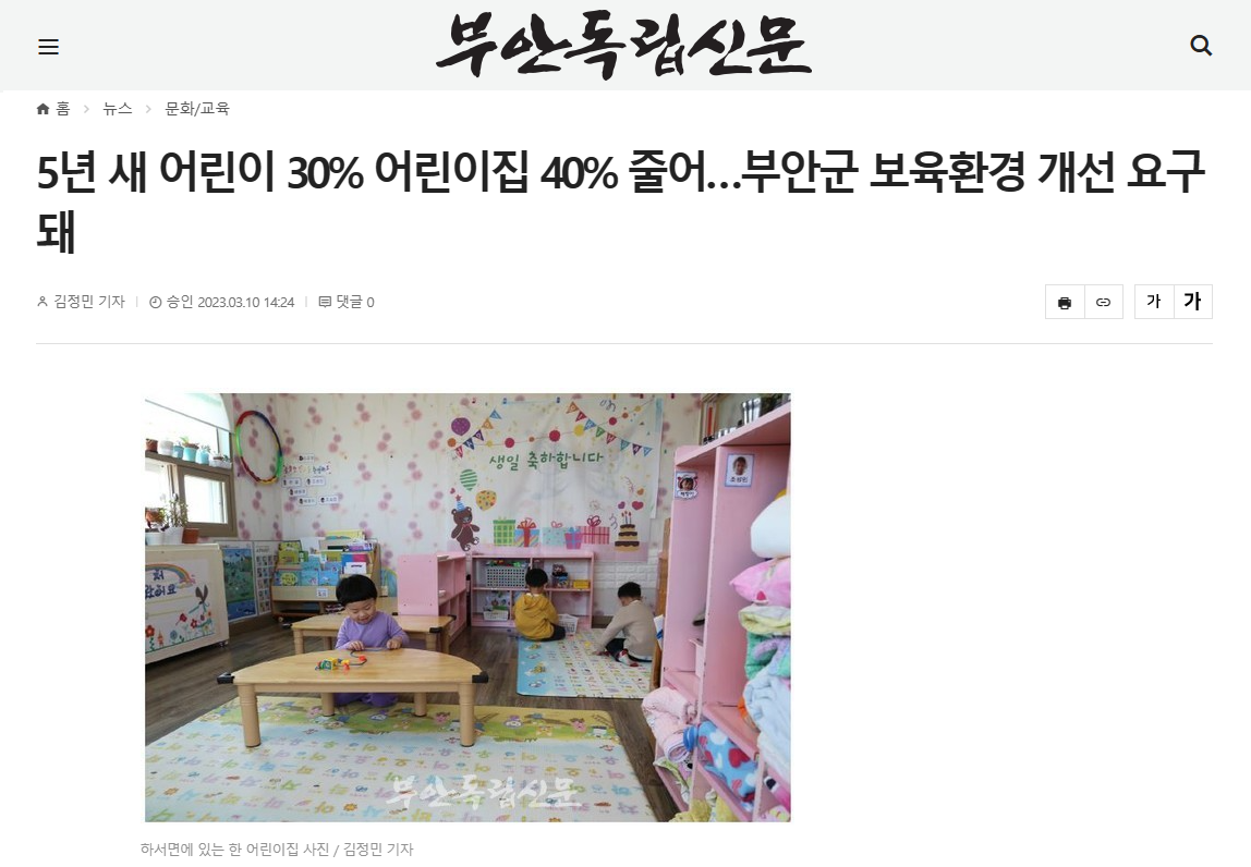 [부안독립신문] 5년 새 어린이 30% 어린이집 40% 줄어... 부안군 보육환경 개선 요구돼(3/10, 3면, 김정민)