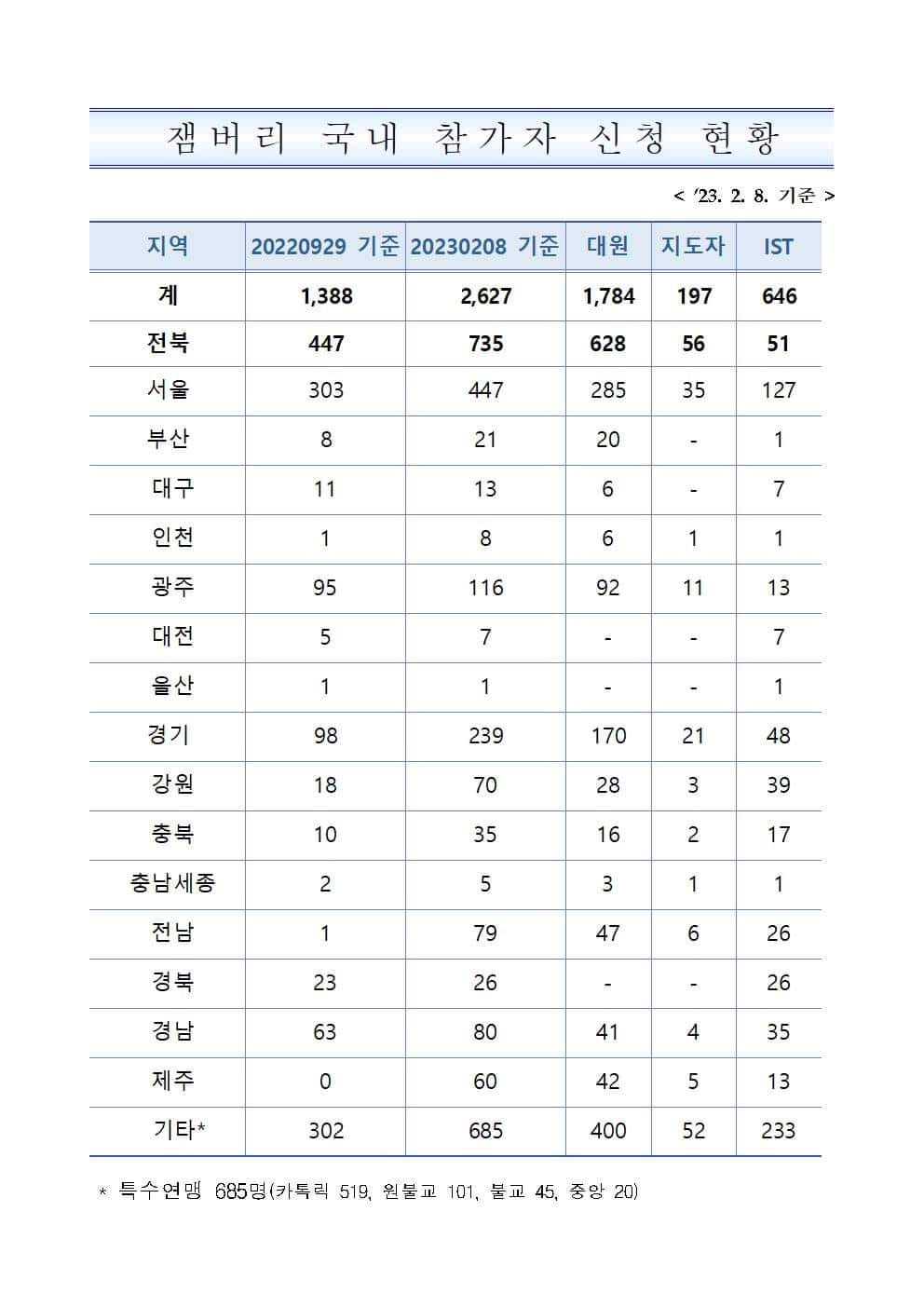 전북민언련에서 도청에 확인한 새만금잼버리 참가자는 2월 8일 기준(5차 모집 마감 후)으로 총 2,627명입니다. 전라북도에서 736명, 서울 447명, 경기도 239명, 광주 116명, 특수연맹에서 685명, 그리고 다른 기타 도시에서 100명 이내로 참석하고 있습니다. 반면 외국인 참가자는 당초 목표한 4만 명을 채운 것으로 확인됩니다. (목표 인원은 5만 명)