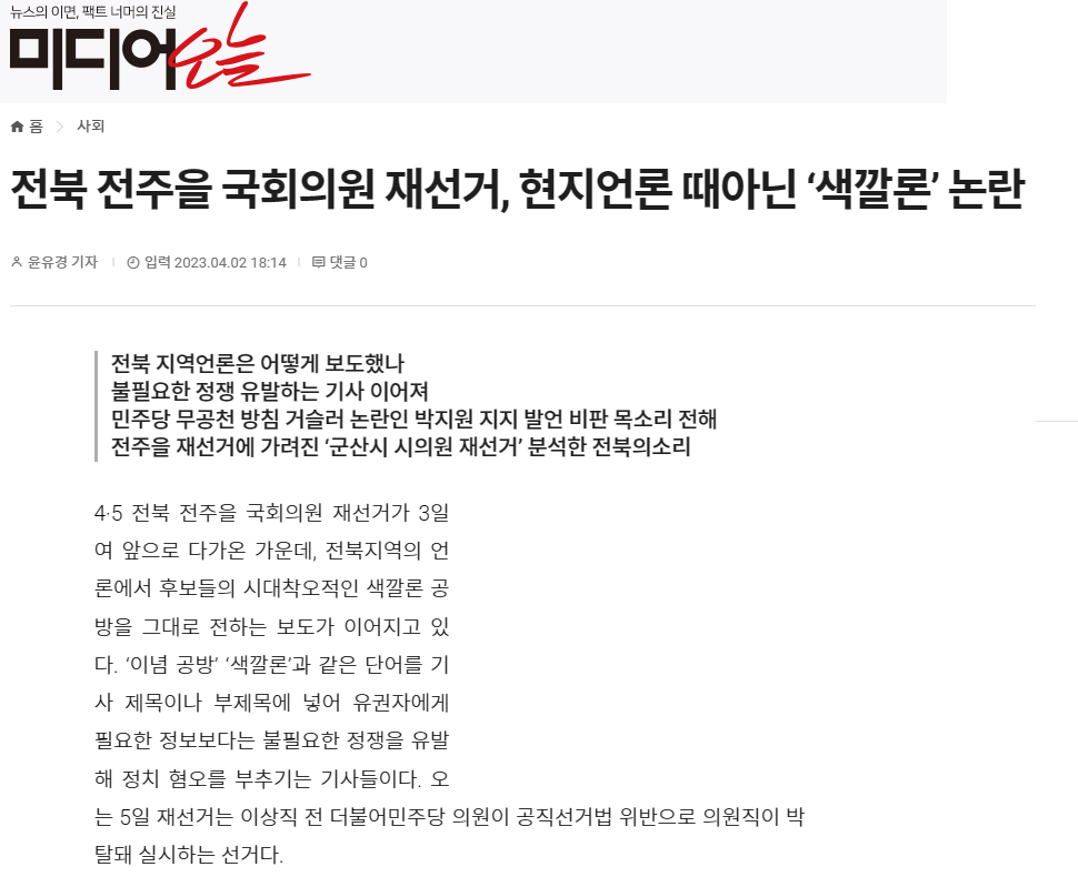 [미디어오늘] 전북 전주을 국회의원 재선거, 현지언론 때아닌 ‘색깔론’ 논란(4/2, 윤유경)