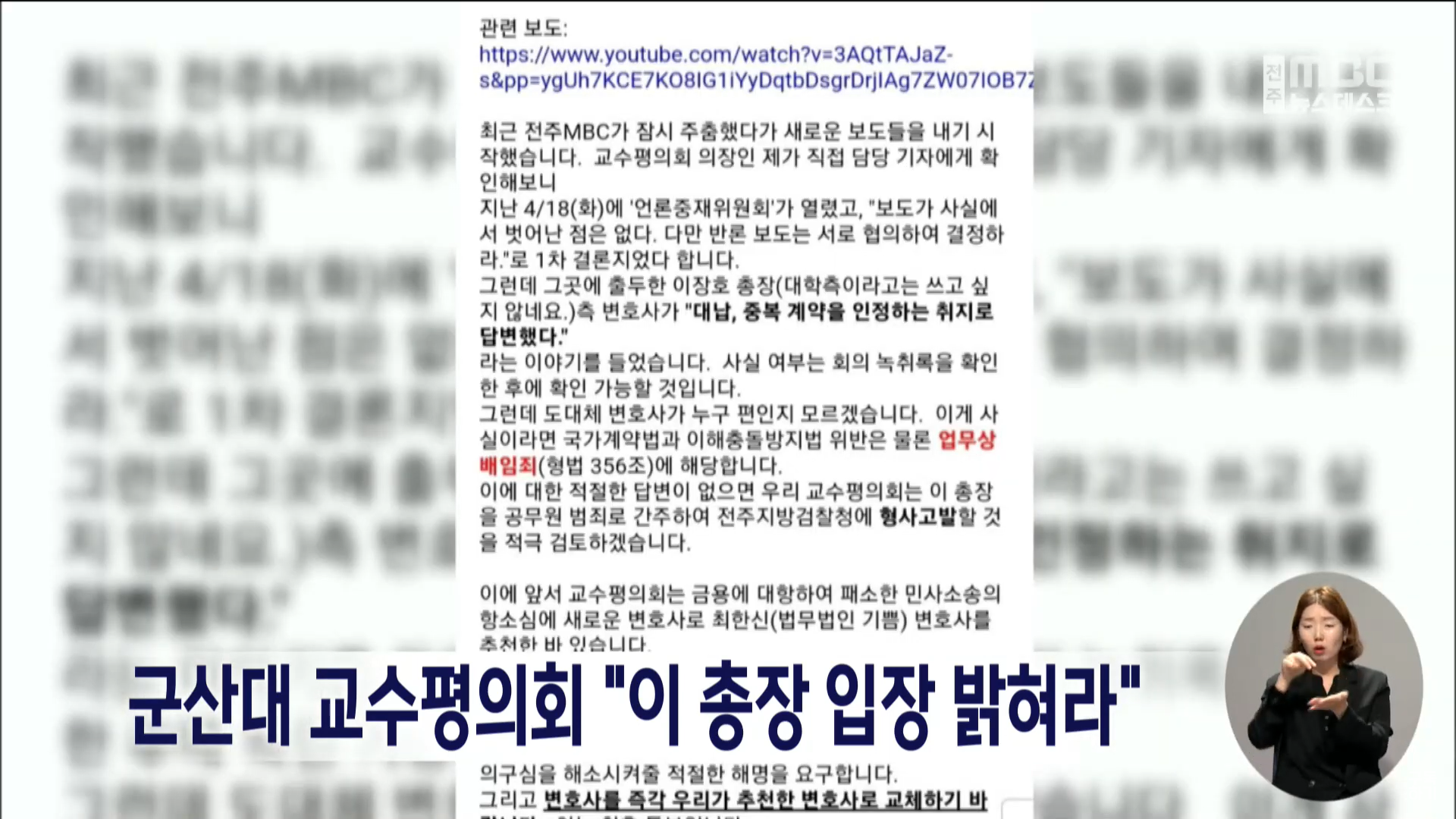 지난 3월 12일 취재 과정에서 이장호 총장은 도급 업체 대표 대신 ‘참관인 자격’으로 계약서에 날인했다고 해명했는데, 전주MBC는 기사 제목을 통해 “도장은 아무나 찍나?”라고 지적하며 정작 계약서에 도급 업체의 도장이나 서명은 없었고 “국립대학교 총장이 연구과제를 수행하면서 학교 측에 손해를 입힌 상황”이라고 정리했습니다.