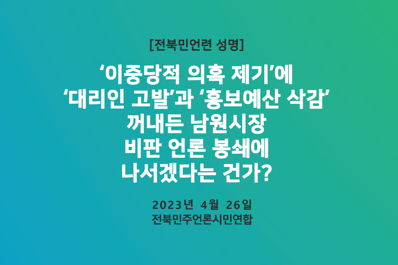 무엇보다 최경식 남원시장과 남원시청의 언론통제 시도는 즉각 중단되어야 한다. 고발을 통해 기자 개인의 취재 활동을 무력화시키고, 홍보예산을 통해 언론을 통제하려는 시도는 결국 시민적 저항에 직면할 수밖에 없다.