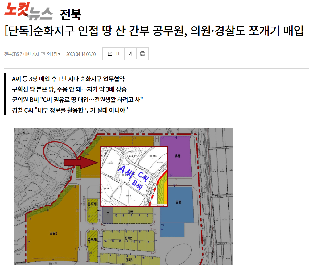 1. [단독]순창군 간부 공무원, 순화지구 개발 전 인접 땅 샀다(4/13, 남승현, 김대한 취재기자)