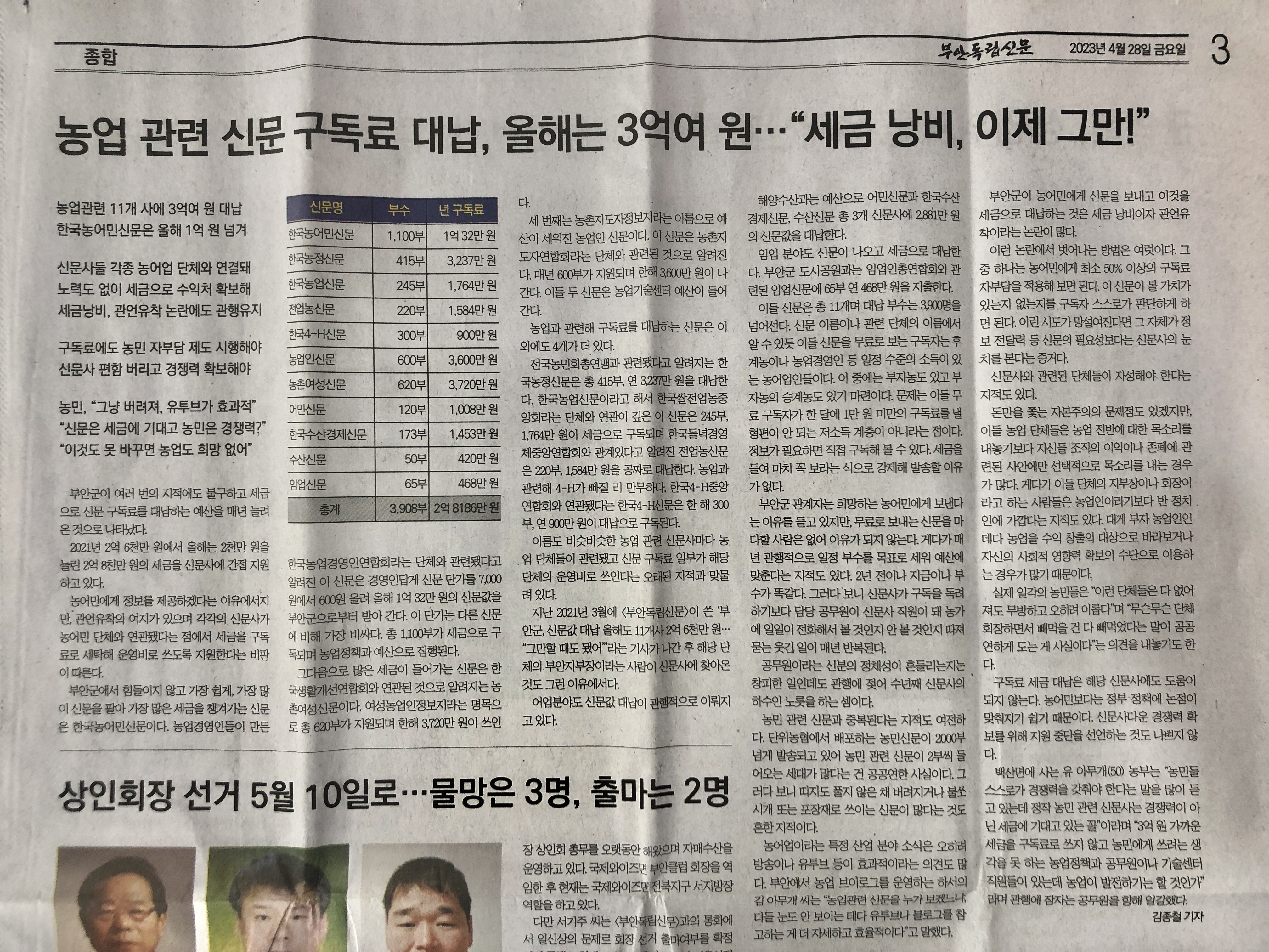 1. 부안군 농어업 관련 신문 구독료 대납, 올해는 3억여 원…“세금 낭비, 이제 그만!”(4/28, 김종철 취재기자)