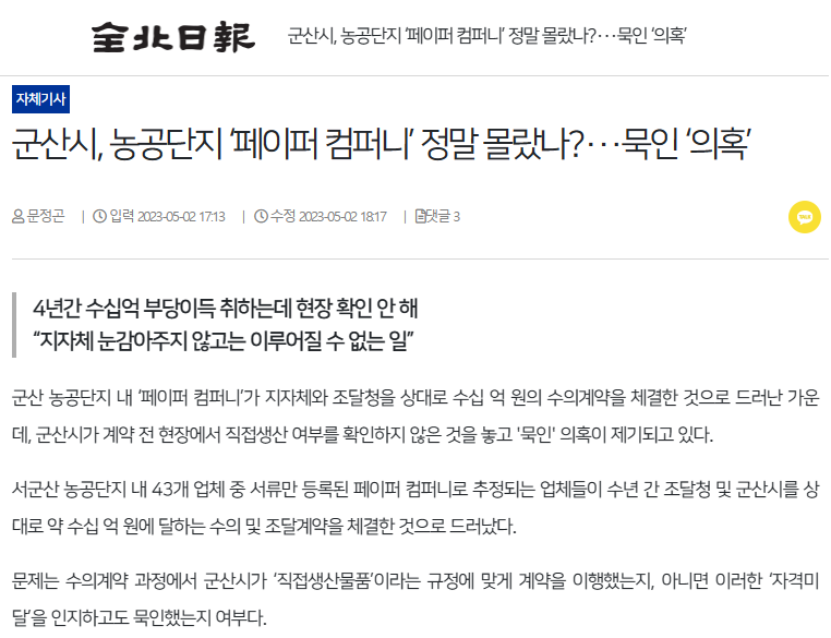 [전북일보] 군산시, 농공단지 ‘페이퍼 컴퍼니’ 정말 몰랐나?···묵인 ‘의혹’(5/2, 문정곤)