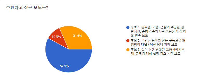 202304월의 좋은 기사는 세 개의 후보 중 <공무원, 의원, 경찰의 수상한 전원생활, 순창군 순화지구 부동산 투기 의혹> 전북CBS 연속 보도가 57.9%의 투표를 받아 202304월의 좋은 기사로 선정되었습니다. 축하드립니다.