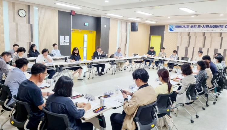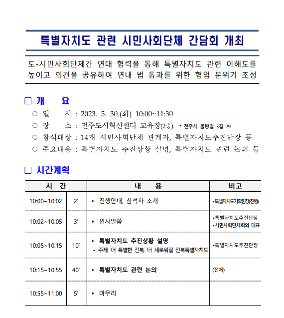 2023년 5월 30일 전주도시혁신센터 교육장에서 전북특별자치도 관련 시민사회단체와 간담회가 진행되었습니다. 전북특별자치도 추진상황 및 전부개정안에 대한 설명이 있었고 2040년을 기준으로 한 기대효과 등을 확인할 수 있었습니다. 특별자치도추진단장 설명 이후 참석자들을 중심으로 여러 특례 조항에 대한 질의응답을 이어갔습니다.