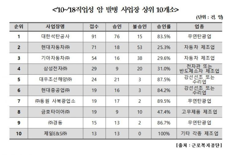 현대자동차의 경우 암 발병 산업재해 승인율이 25.3%로 상위 10개 기업 중 가장 낮은데요, 그래도 과거부터 비슷한 사례가 있었던 만큼 이번 전주공장 사례에 대한 지역 언론들의 관심과 철저한 조사가 필요해 보입니다.