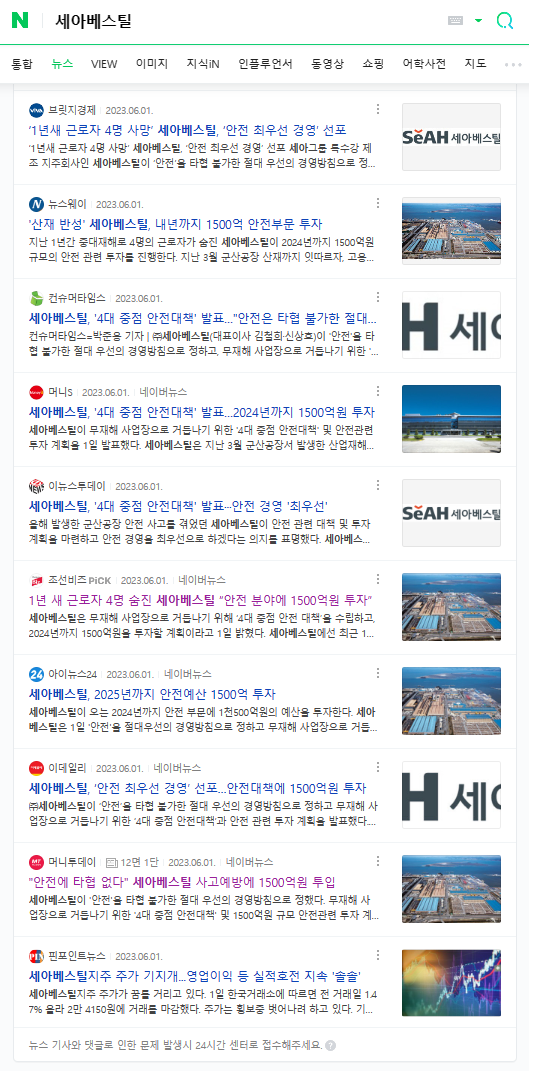 #세아베스틸 ‘1500억 투자’, ‘안전’ 강조한 제목의 기사만 수두룩