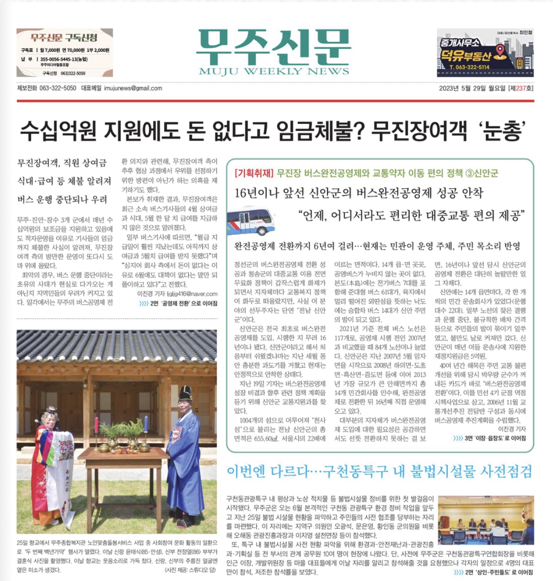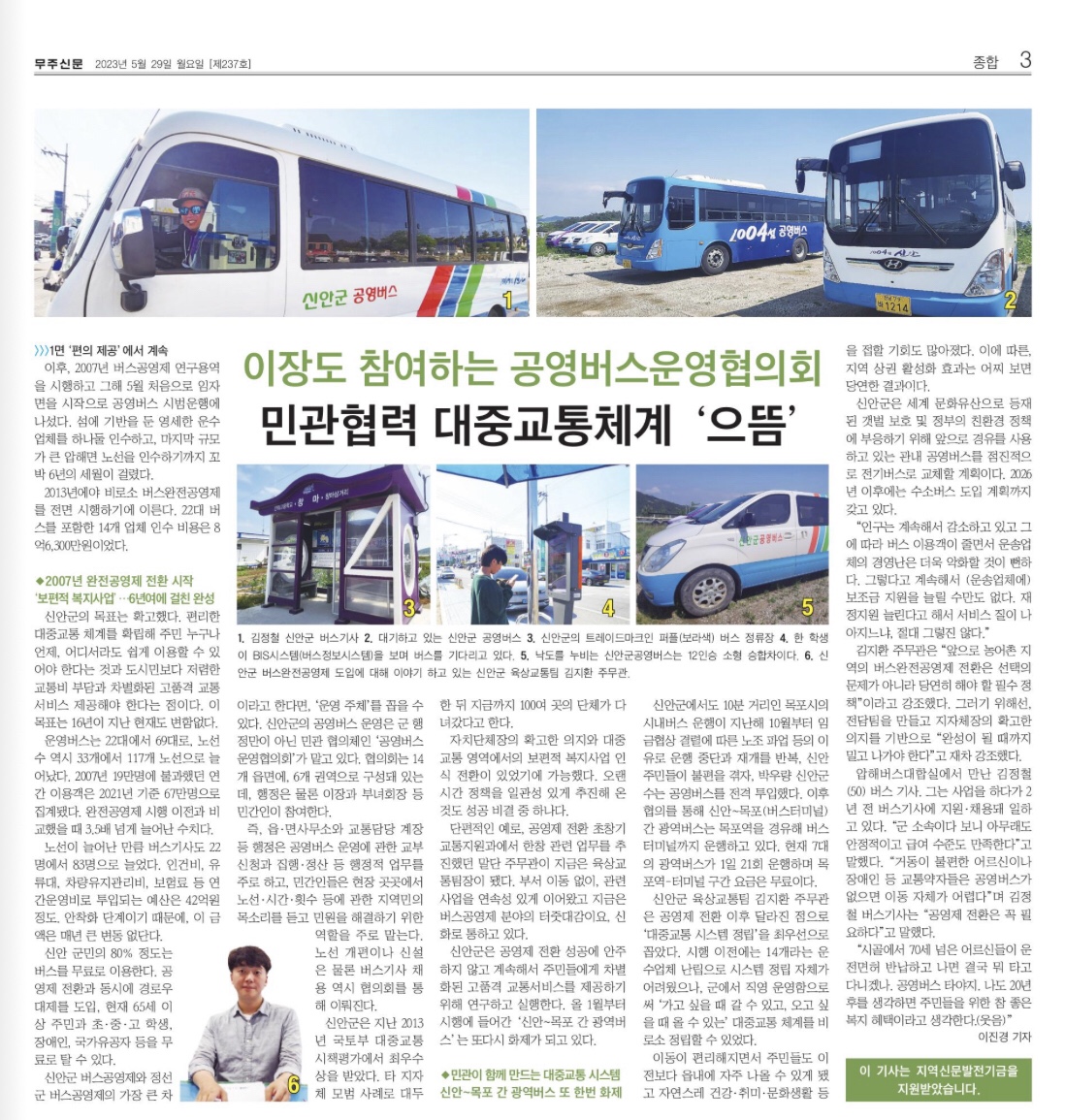 [무주신문] 16년이나 앞선 신안군의 버스완전공영제 성공 안착 “언제, 어디서라도 편리한 대중교통 편의 제공”(5/29, 1면, 3면, 이진경)