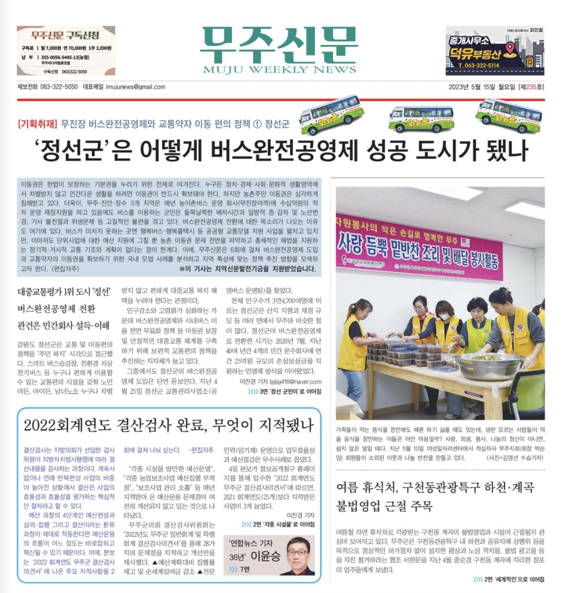 [무주신문] ‘정선군’은 어떻게 버스완전공영제 성공 도시가 됐나(5/15, 1면, 3면, 이진경)